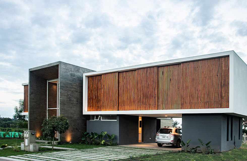 En planta alta, dividido en dos sectores muy marcados, se sitúa la zona íntima, donde se ubican los dormitorios familiares. Lamas de madera de Kiri cubren la fachada para generar mayor intimidad. Se destaca el volumen principal de hormigón en doble altura, creando una espacialidad y experiencia única.